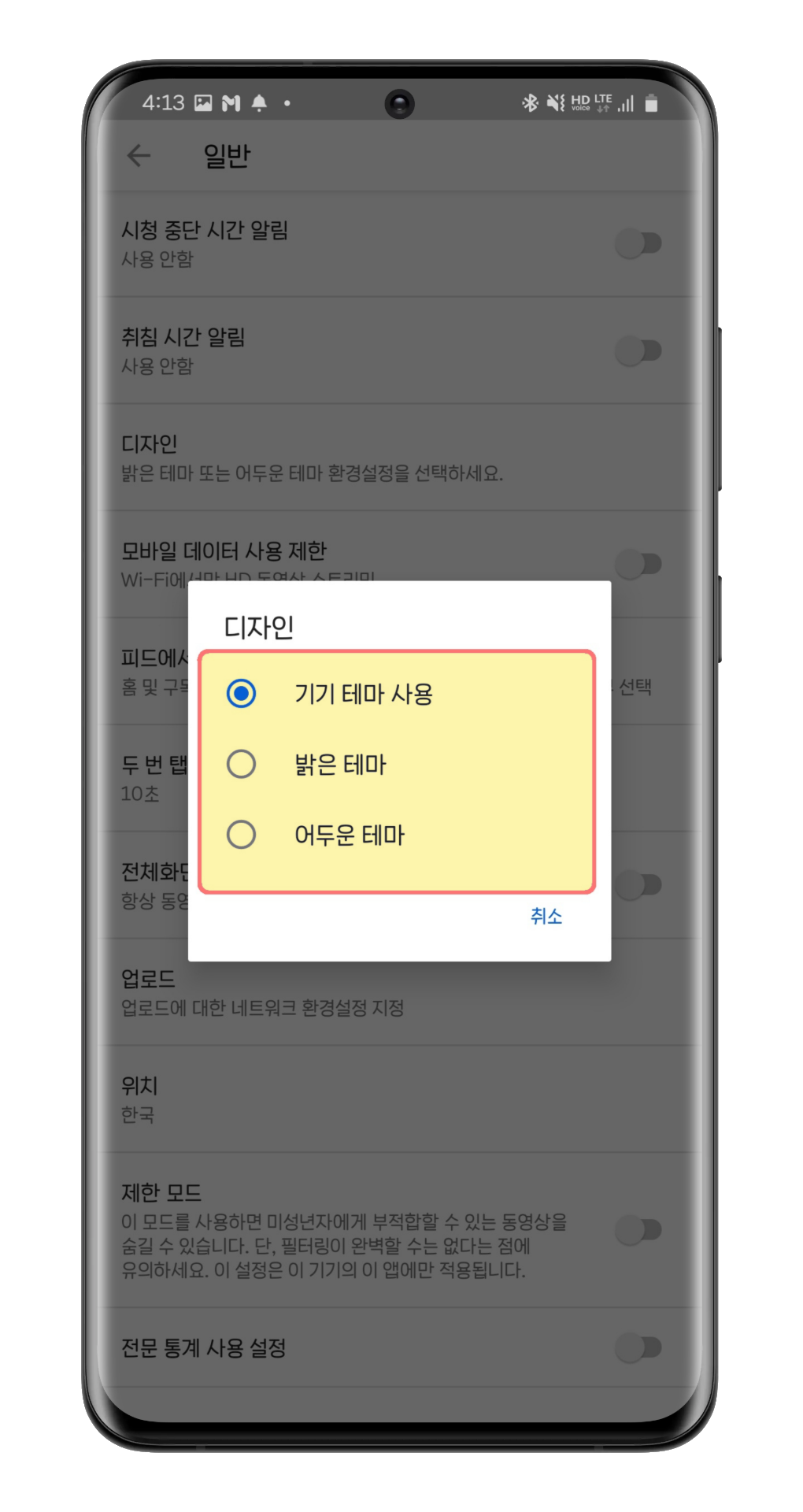 기기 테마 사용은 폰 다크 모드 설정에 따라 자동으로 바뀌는 방식이고 밝은 테마는 폰 다크 모드와 상관없이 유튜브 앱은 항상 밝은 테마로 사용하는 방식, 어두운 테마는 항상 어두운 테마로 사용하는 방식입니다.