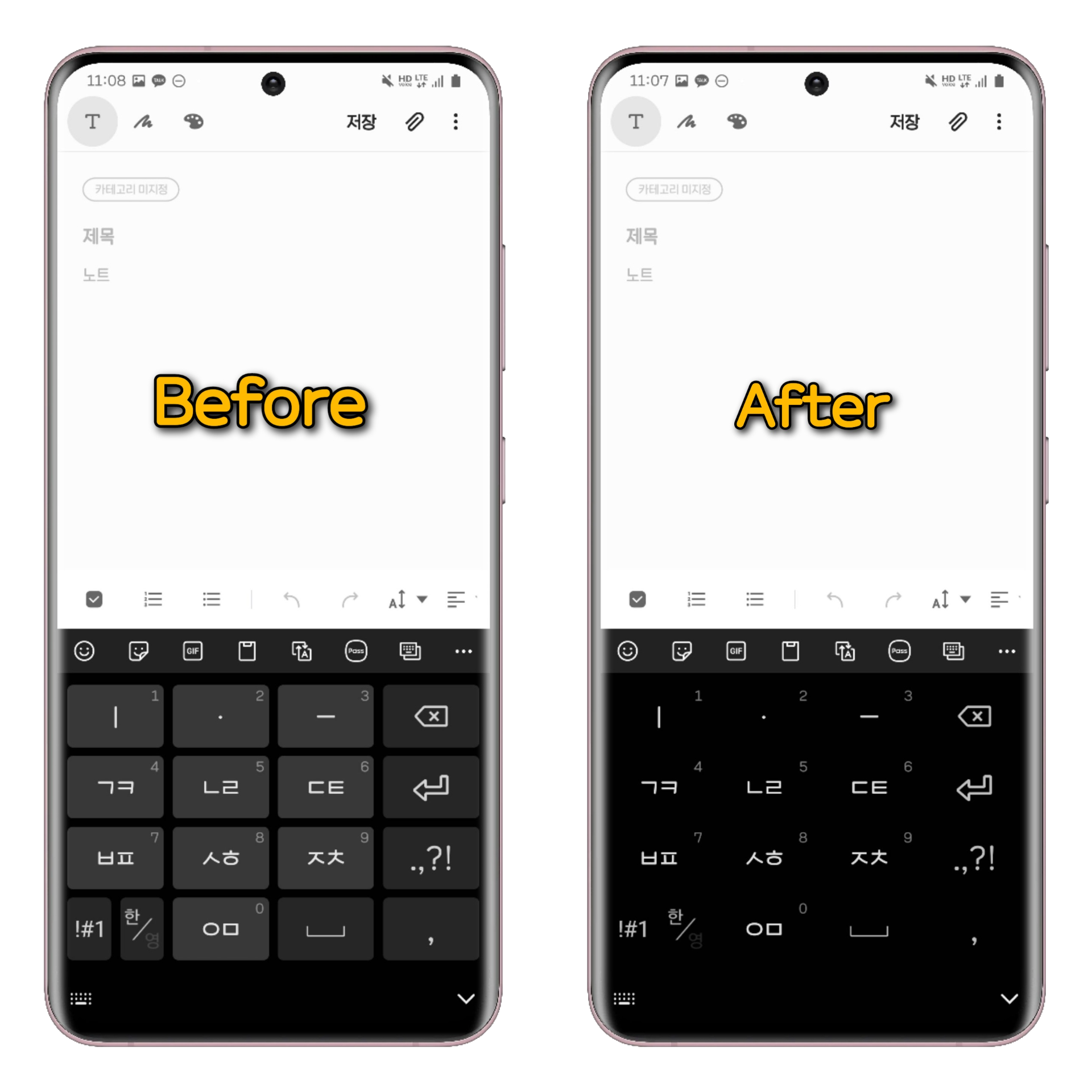 완전히 밝게로 설정하고 삼성 키보드를 보면 이렇게 키 테두리가 없어져서 조금 더 깔끔한 모습으로 보입니다!