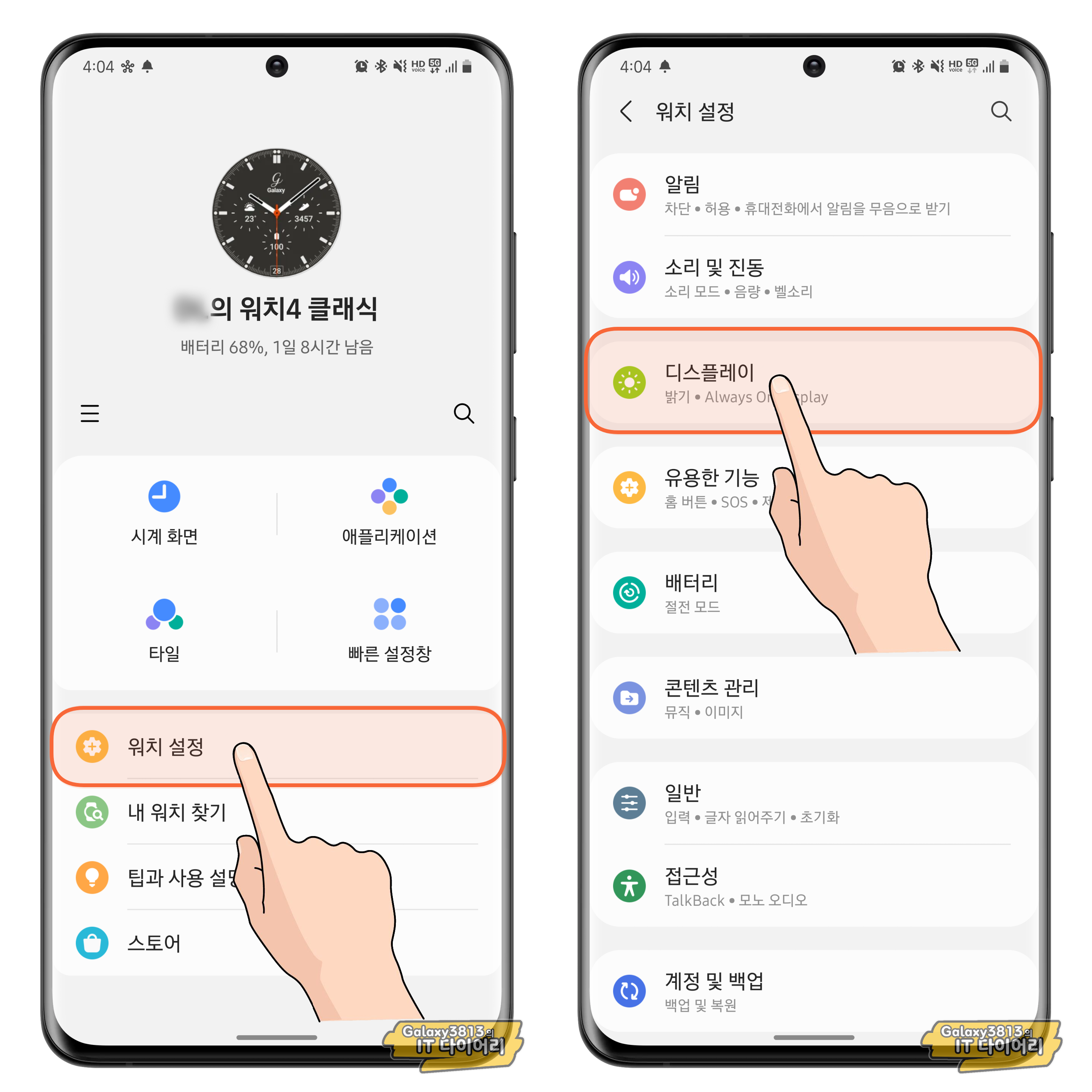 Galaxy Wearable 앱에서 워치 설정 메뉴로 들어간 다음 디스플레이로 들어가 주세요.